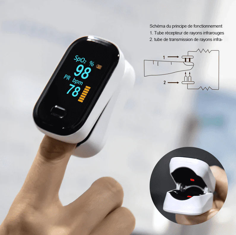 Notre oxymètre mesure efficacement, rapidement et avec précision le taux d'oxygène présent dans votre sang et évalue votre rythme cardiaque (BPM). Il est conçu pour fournir des données précises pour une évaluation sûre de vos données corporelles !