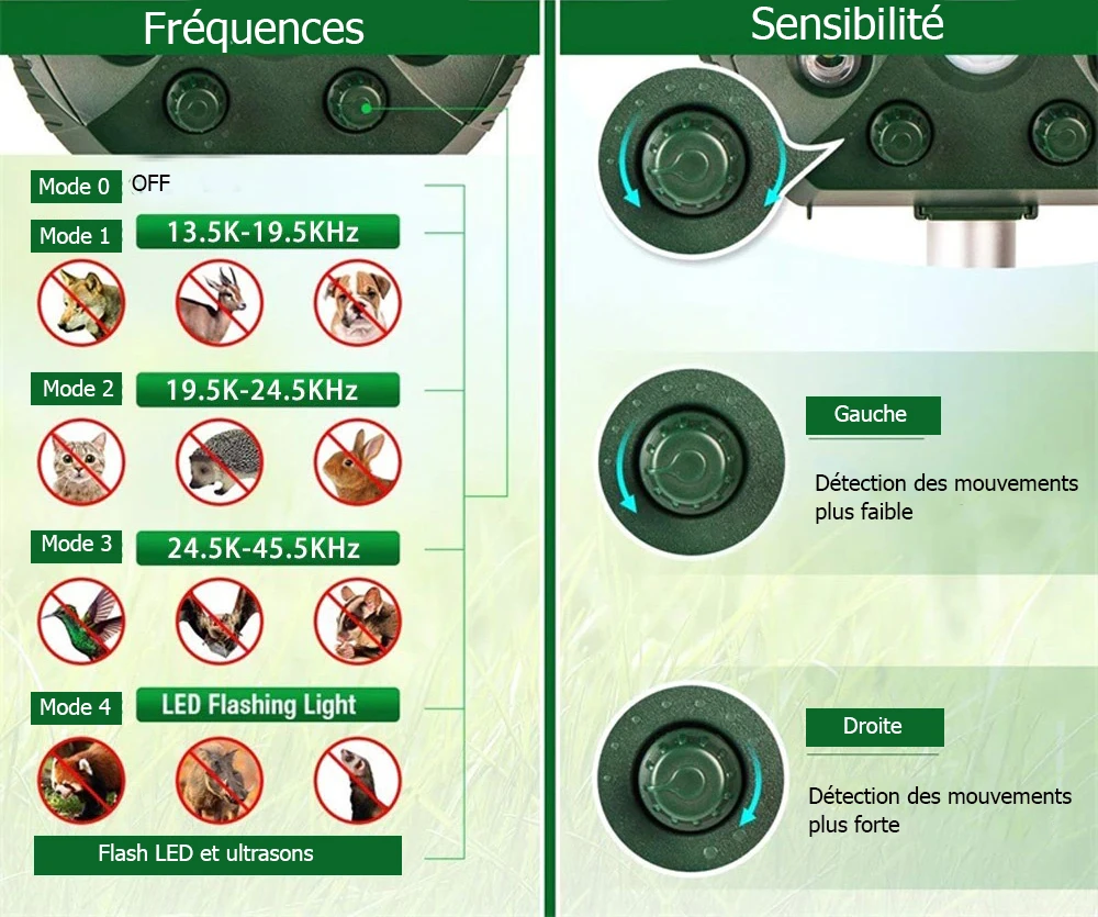 - Mode 2 : 19.5KHZ-24.5KHZ, principalement pour les chats, ratons laveurs, moucherons.